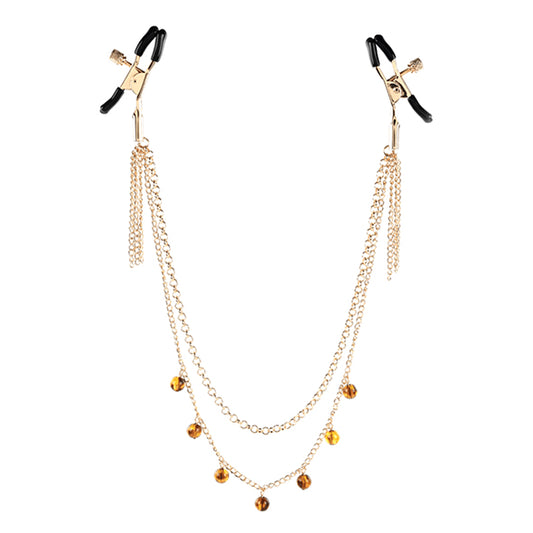 - Verstelbare tepelklemmetjes met vergulde goudkleurige ketting met amber kralen.