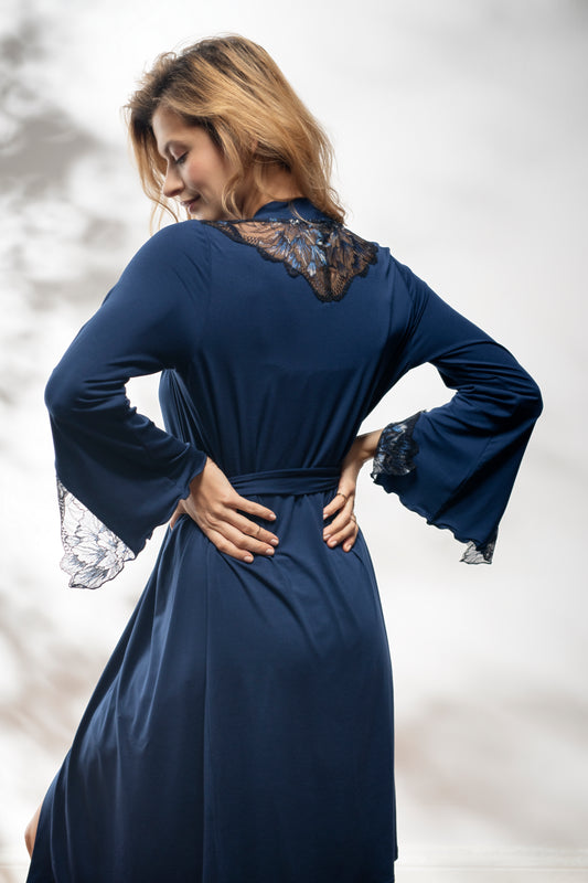 De peignoir heeft een stijlvolle marineblauw kleur en is afgewerkt met gebloemd kant en borduurwerk aan de mouwen en aan de achterzijde. De combinatie van de rijke kleur en de verfijnde kantdetails geeft het geheel een elegante uitstraling. Er is ook een bijpassend nachtjurkje verkrijgbaar om de set compleet te maken.