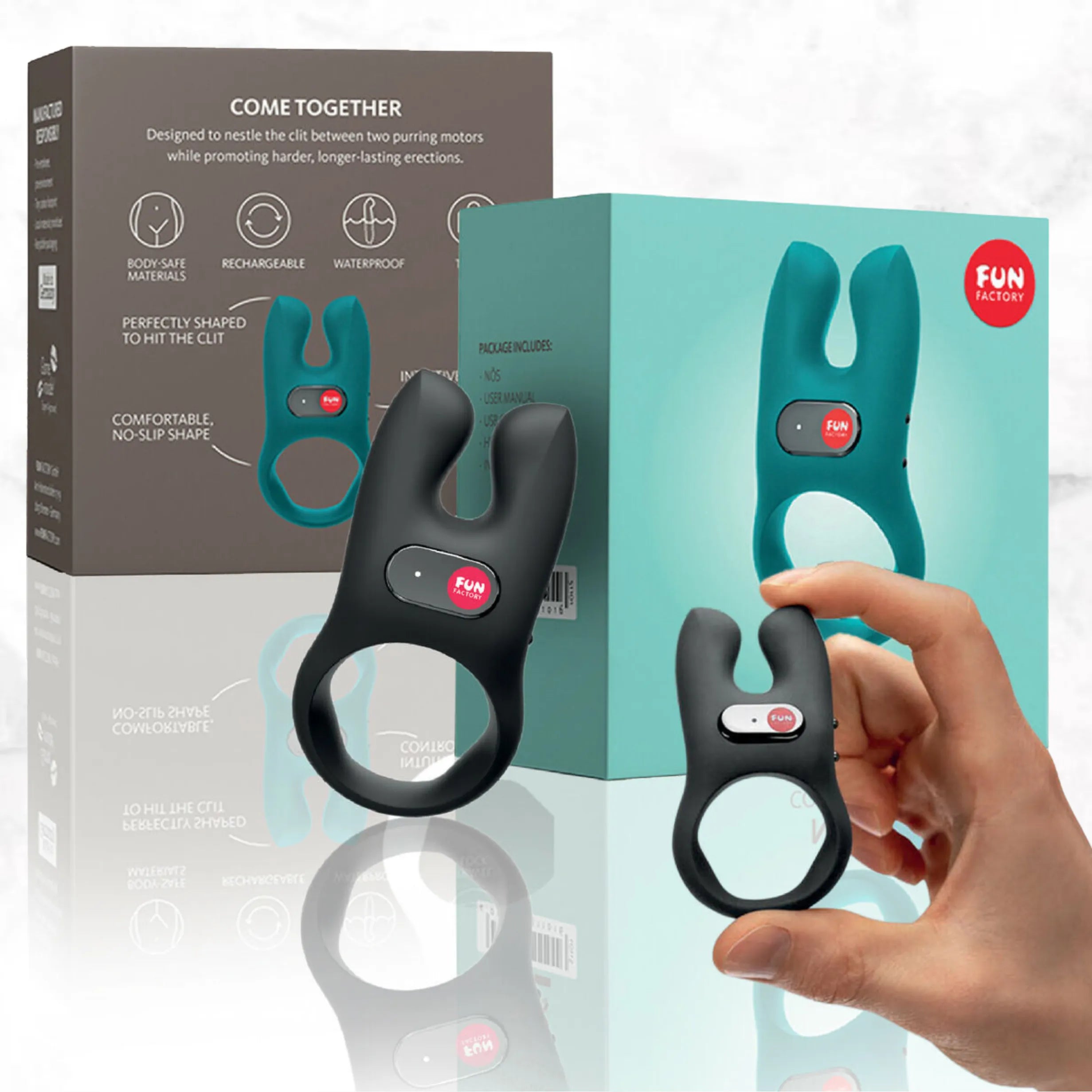 Wat opvalt is dat de ring niet rond is. Fun Factory bootst de basis van een penis na, de plaats waar de ring gedragen wordt, om zo betere drukpunten te creëren voor een krachtige erectie. De ring voelt zacht aan en is rekbaar en heeft 1 knop voor aan- en uitzetten. Tevens zit er een reisslot op. Door telkens 1 keer op de knop te drukken verhoog je de vibraties tot stand 4 en door nog 1 keer te drukken kom je in de vijfde stand wat een ritme is. Na ongeveer 1 uur laden heb je 1 uur speeltijd op de hoogste stand. Tevens is de ring volledig waterdicht.